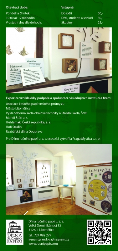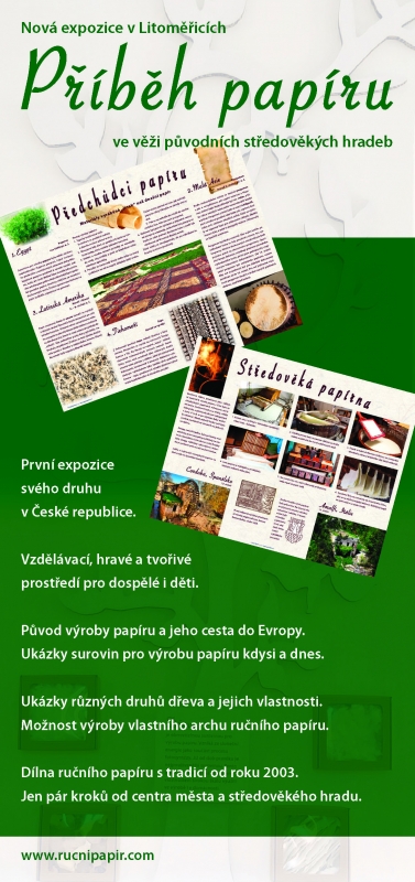 Od roku 2014 spolupracujeme s Dílnou ručního papíru v Litoměřicích, která sídlí v krásných historických prostorách v městských hradbách. V útulném prostředí postupně ztvárňujeme "Příběh papíru". Návštěvníci se dozví o předchůdcích papíru, o jeho původu, jak se vůbec dostal do Evropy a odkud... Historické informace doplňují ty nejnovější o technologii výroby papíru dnes.